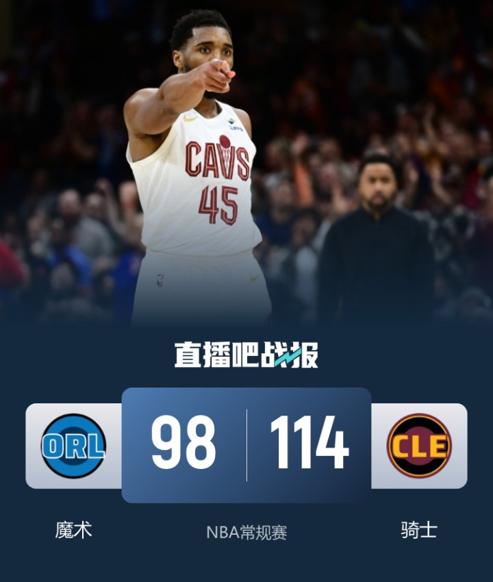比赛开始,贝恩和布莱克包揽魔术前10分,米切尔和小莫布里一内一外苦苦回应,但魔术首发五虎多点开花还是领先到10分,次节双方在外线展开对轰,米切尔接连外线发炮带队12-2一度反超比分,随后比分多次打平,米切尔再发力单节16分带队反超5分。下半场,班凯罗包办球队前8分,但米切尔依然保持不错状态给出回应,骑士越打越好拉开双位数领先,末节双方围绕10分左右分差继续拉锯战,米切尔中投突破40分,骑士牢牢掌握主动权,最终骑士114-98再胜魔术。