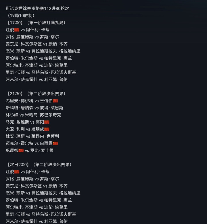 今天下午五点,江俊出战卡蒂,第一阶段比赛打满九局。另外,明天凌晨两点,第二阶段比赛决出胜负。
