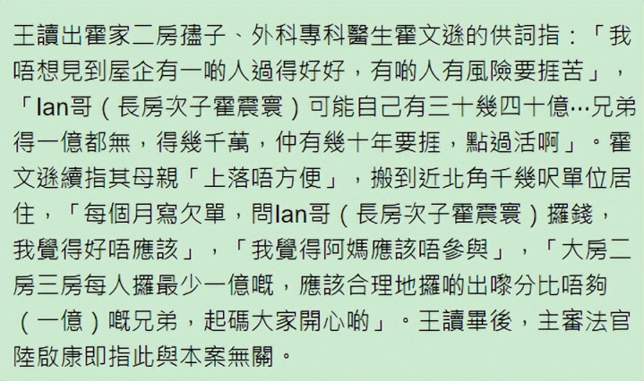 值得一提的是,在几年前的南沙地皮争产官司发生时,冯坚妮的小儿子霍文逊曾爆料,母亲住在只有一百平米的房子里,不是豪宅平层,而是小区高楼,每天要上上下下十分不方便,每个月要等着“二哥”霍震寰发生活费。