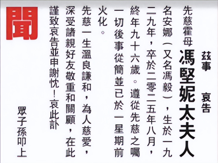 霍家在8月28日正式对外公布,因为没有大办丧礼,外界并不知情。从讣告来看,冯坚妮的葬礼在8月中旬完成,遗体已经火化,霍家作风俭朴,深受大家好评,不过娶三房太太属于敏感问题,放在现代社会难免会引起争议,或因如此,霍家才没有像大房太太那样大办丧礼吧。