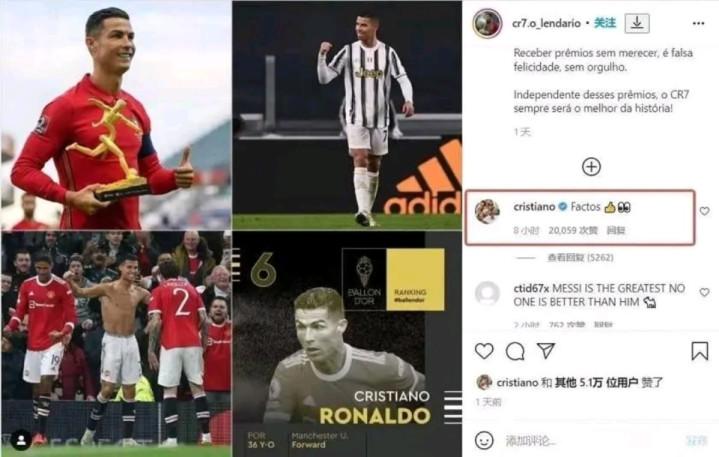 然而,C罗这次却在该球迷的帖子下点赞,并且回复了“这是事实”之类的话语,言语之间充斥着不服梅西的情绪。