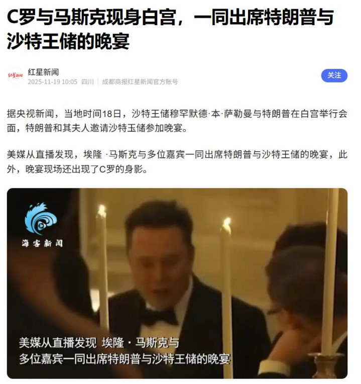 当美国总统特朗普与沙特王储在白宫举行国家层面会晤时,C罗被邀请同马斯克一起出席晚宴,其影响力俨然已超越体育界。