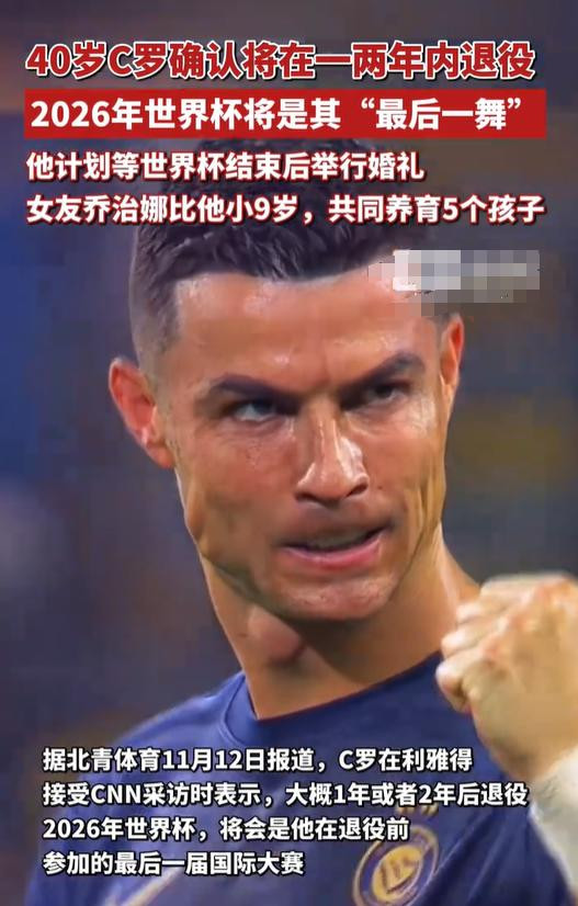 原因无他,C罗在接受一官方媒体采访时曾表明其大概会在2年后退役,2026年的世界杯或许将是其“最后一舞”。