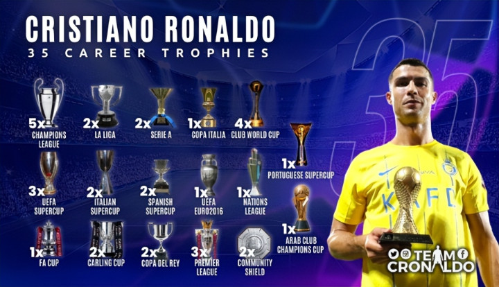 原因在于,除却世界杯奖杯之外,有关足坛的重量级奖项,C罗几乎全部囊括。