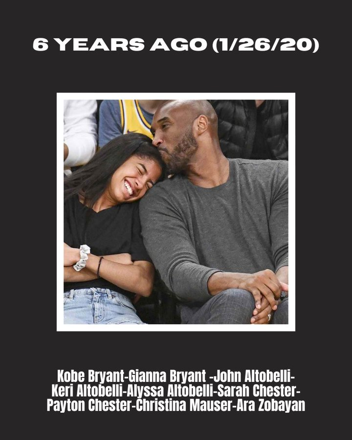 湖人自媒体发推表示:6年前,科比-布莱恩特、吉安娜-布莱恩特、JohnAltobelli、KeriAltobelli、AlyssaAltobelli、ChristinaMauser、SarahChester、PaytonChester、AraZobayan。我们每天都想念你们。愿你们安息