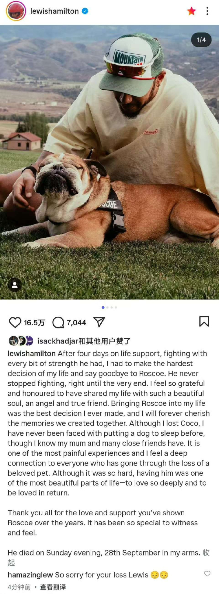 虎扑09月29日讯汉密尔顿在社交媒体上告知车迷们一个悲伤的消息:他的爱犬Roscoe于昨晚去世。