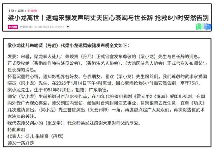梁小龙病逝于1月14日,根据其遗孀宋骧委托徒儿朱峻贤发出的声明可知,梁小龙在病理角度是因心力衰竭抢救6小时后离世。