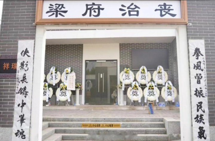 灵堂门外粘贴着手写挽联“拳风曾振民族气,侠影长铸中华魂”,横批“梁府治丧”。