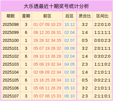 上期回顾:大乐透2025107期开出奖号:前区05、07、08、15、33,后区06、10。