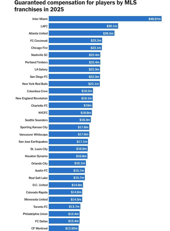 近日,美职联球员工会发布了2025赛季第二次薪资更新,联盟30支球队的工资支出被完整呈现在所有人的面前。
