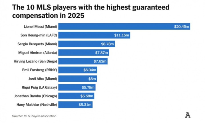 不出所料,梅西以超过2000万美元的年薪继续领跑全联盟,收入是其他球员(除孙兴慜外)的两倍以上。他本赛季交出29球19助攻的亮眼数据(两项统计均居联赛首位),有望成为MLS史上首位蝉联MVP的球员。