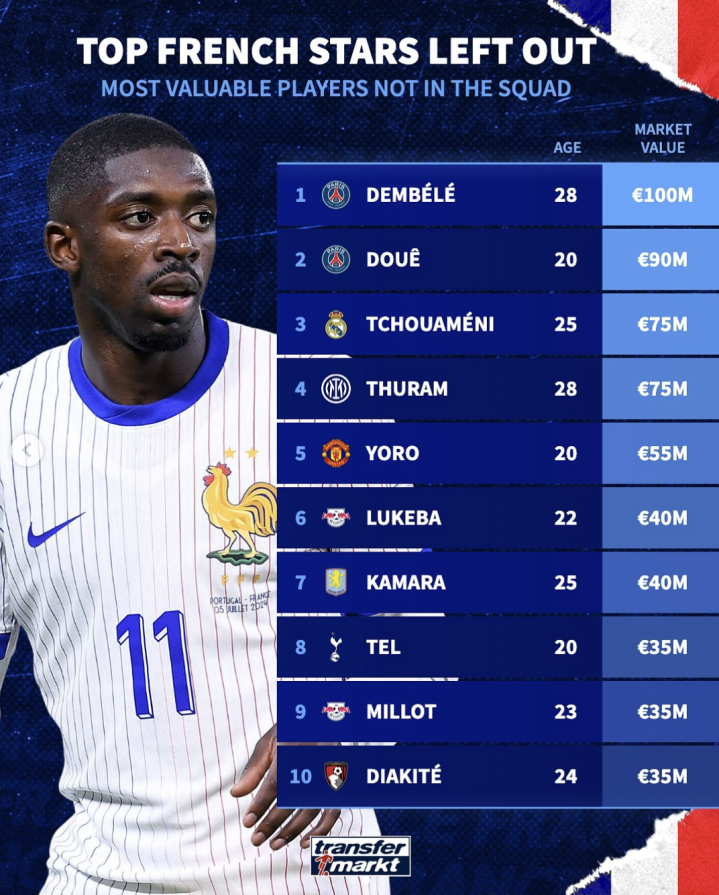 虎扑11月13日讯德转统计了落选最新一期法国队的球员身价榜。